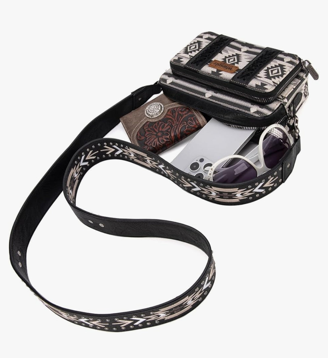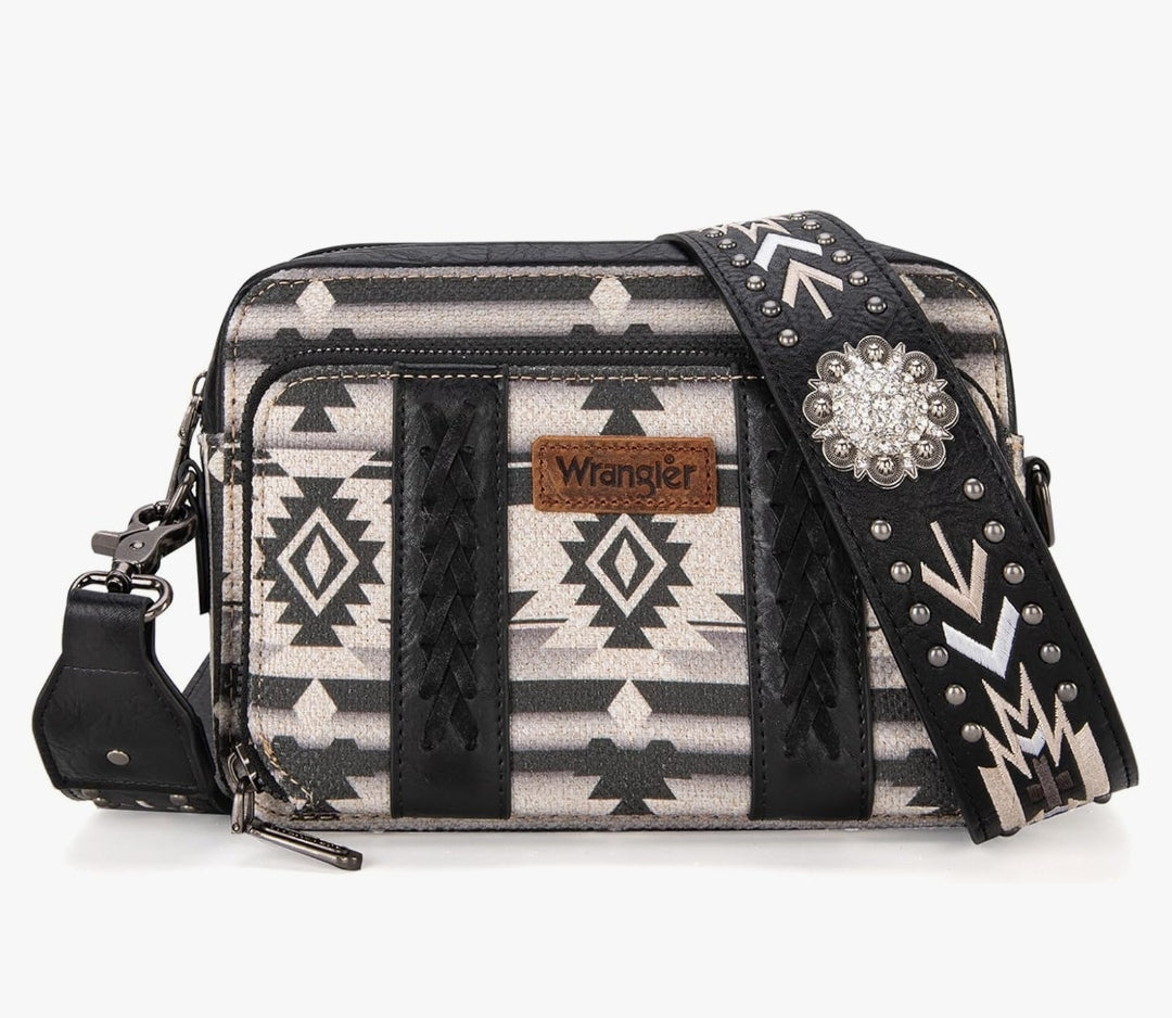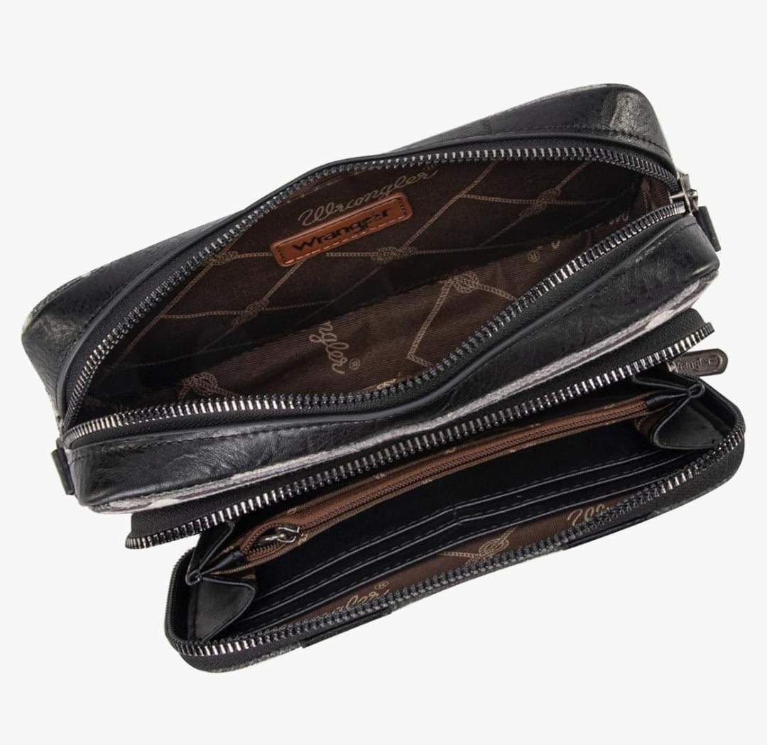 Wrangler Aztec Printed Crossbody Purse With Wallet Compartment - Black