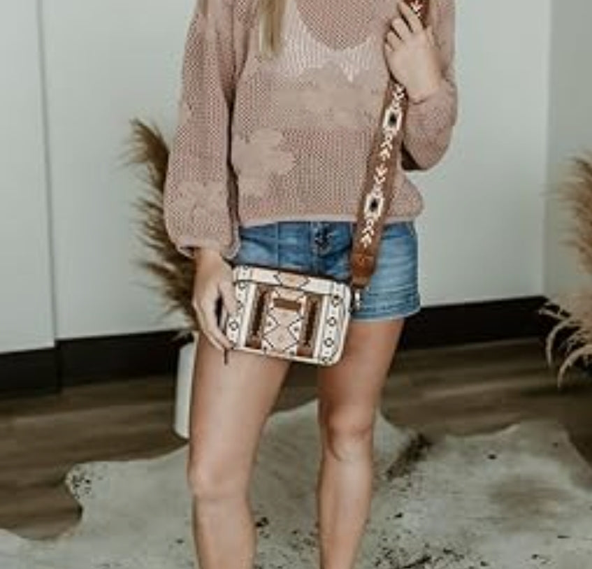 Detachable embroidered Aztec pattern on the PU crossbody strap,